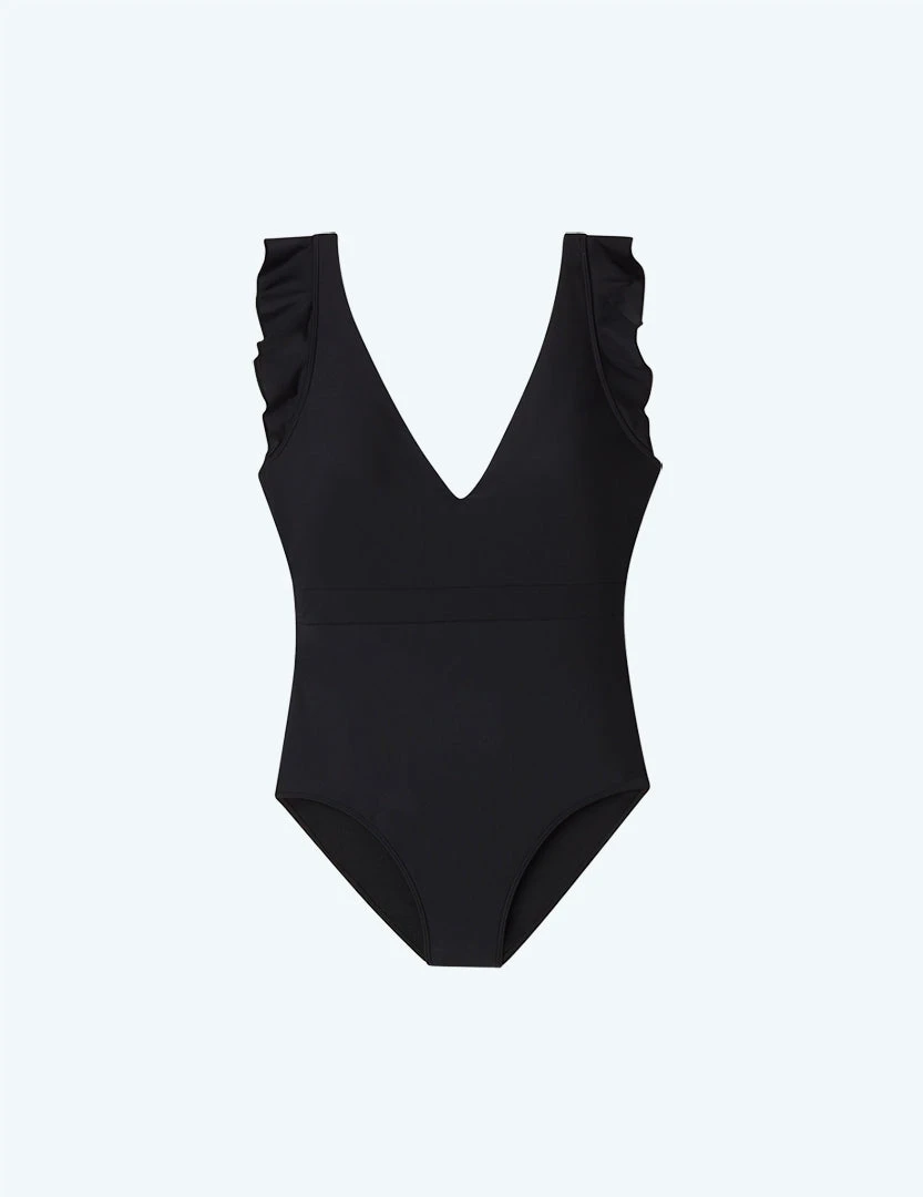 A deep vee front, a stunning open back, and flirty ruffles—this suit has it all. Our signature compression keeps you feeling secure (no tugging or adjusting), and the architectural details make a statement from every angle. Get out there and get ready to turn some heads.Â