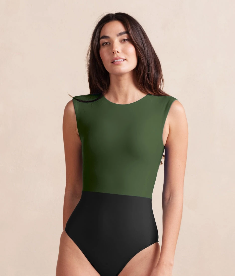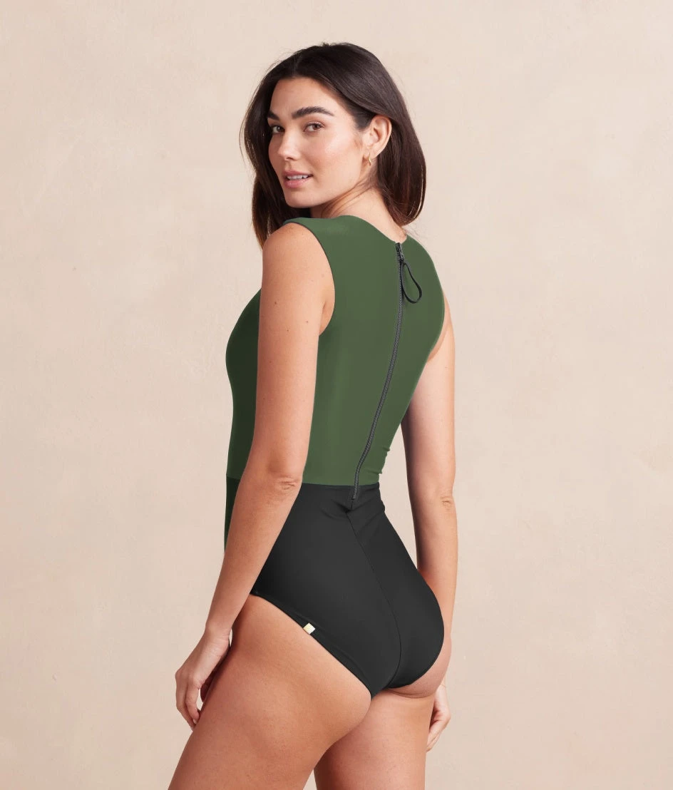 High-neck meets high fashion in this full-coverage, colorblocked beauty.
