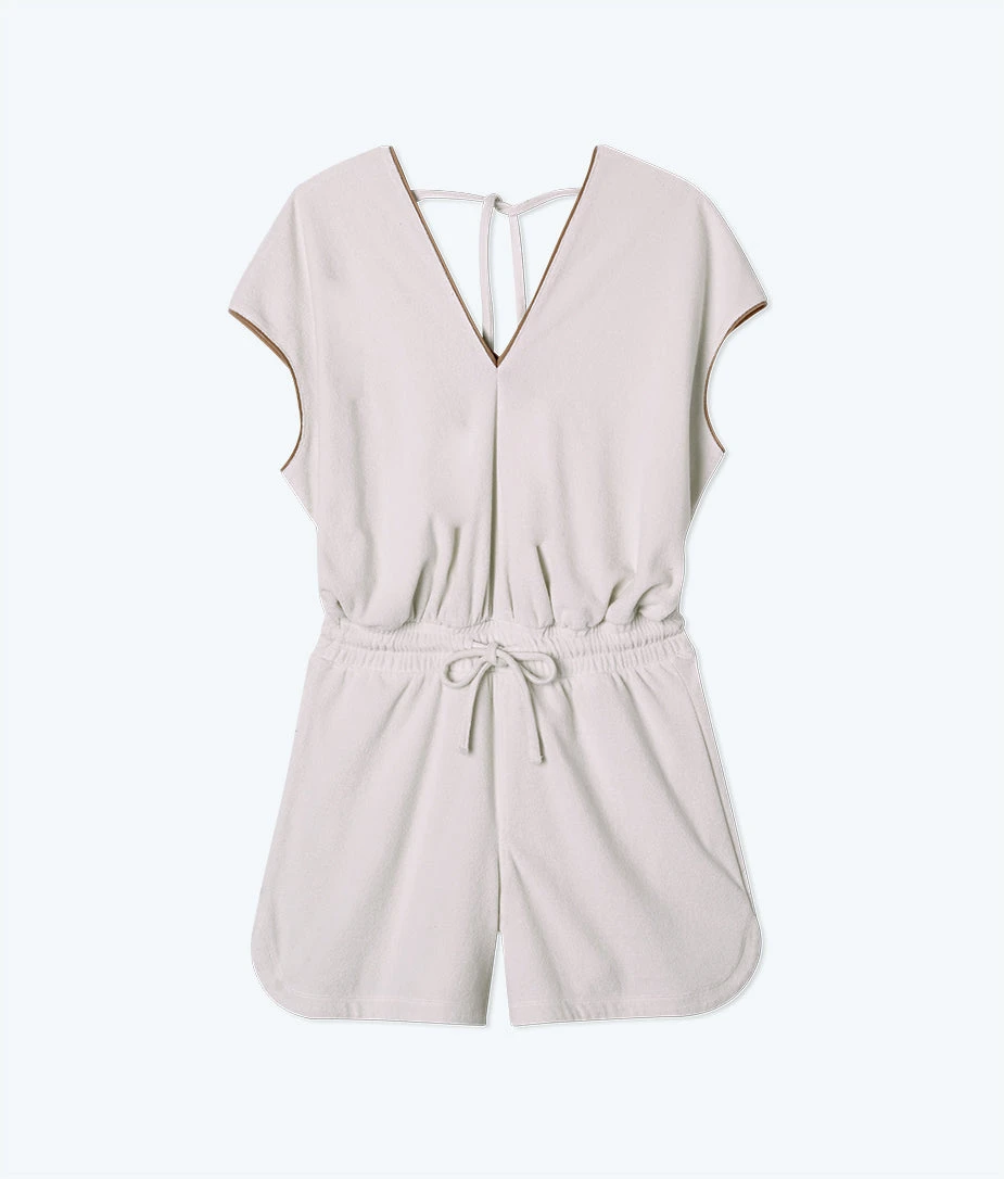 Vintage beach vibes, made modern. This romper is ready for every summer adventure in soft, absorbent towel terry made from a mix of organic and recycled materials. You’ll love the flattering elastic drawstring waist, side pockets, & curved hems that add a touch of throwback style. Throw it on over your suit, and then simply add sneakers to go from beach to street.